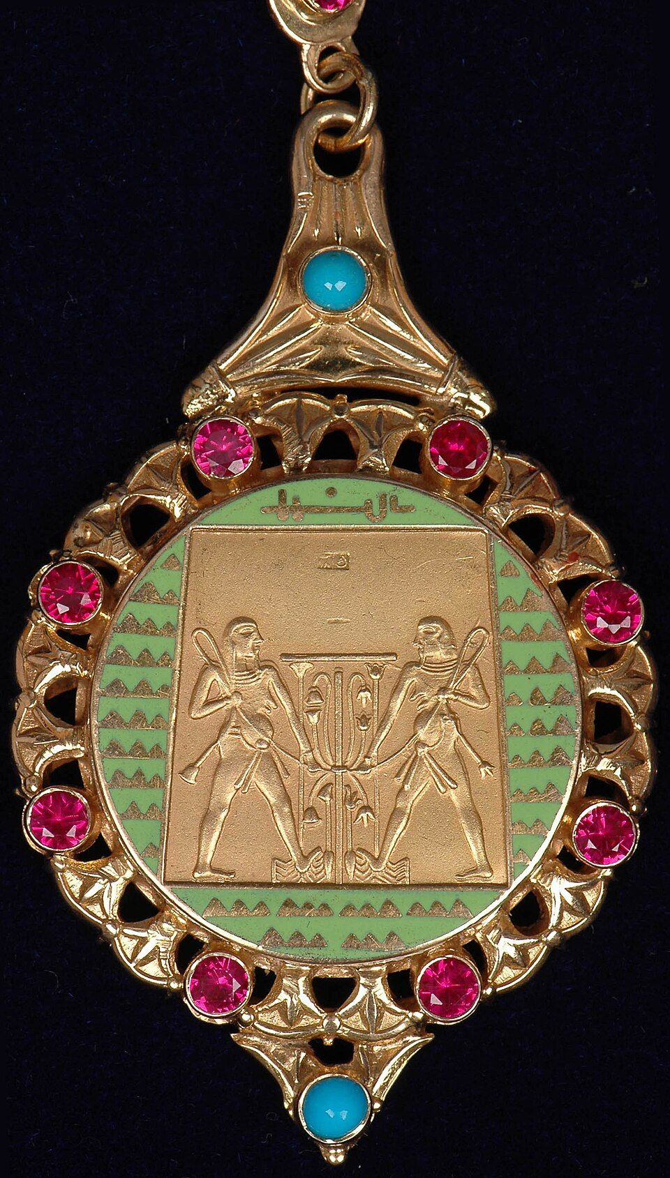 وقلادة النيل صنعت من الذهب الخالص، وتتمثل في سلسلة تتجسد في وحدات متشابكة تمثل رسومًا فرعونية تدل علي الخير والنماء التي يجلبها النيل للبلاد، وما بين كل وحدة وأخرى زهرات من الذهب، وجميعها مرصعة بالميناء من فصوص من الياقوت الأحمر والفيروز الأزرق، وهي أعلي الأوسمة في مصر.