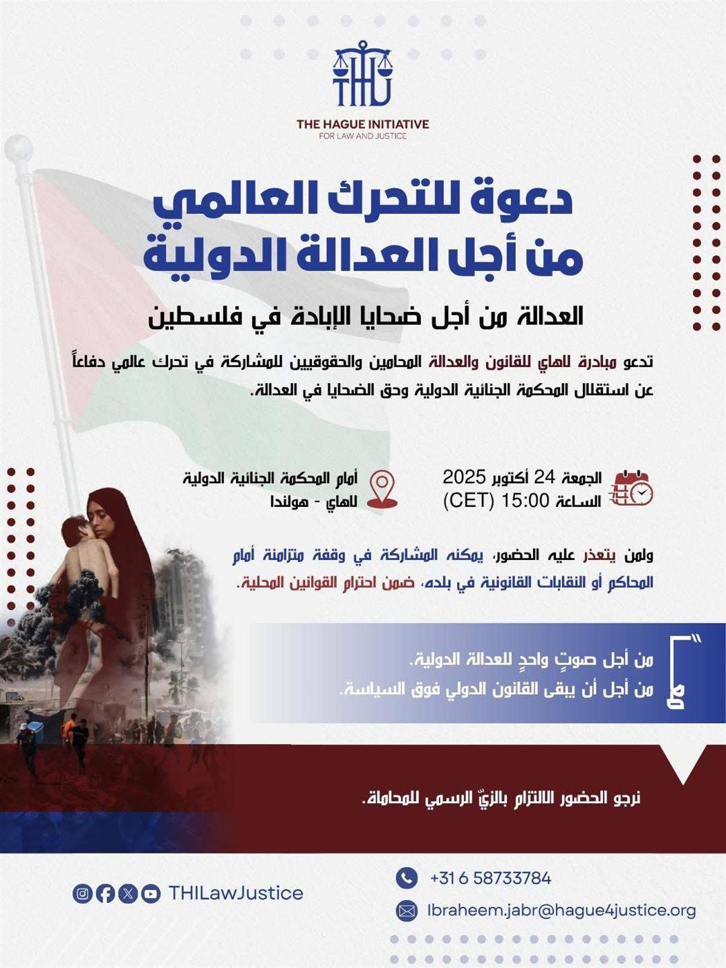 دعت مؤسسة مبادرة لاهاي للقانون والعدالة جميع المحامين والحقوقيين حول العالم إلى المشاركة في تحرك عالمي من أجل العدالة الدولية، دعمًا لاستقلال المحكمة الجنائية الدولية، ونصرةً لحقوق ضحايا الإبادة الجماعية والجرائم ضد الإنسانية في فلسطين.