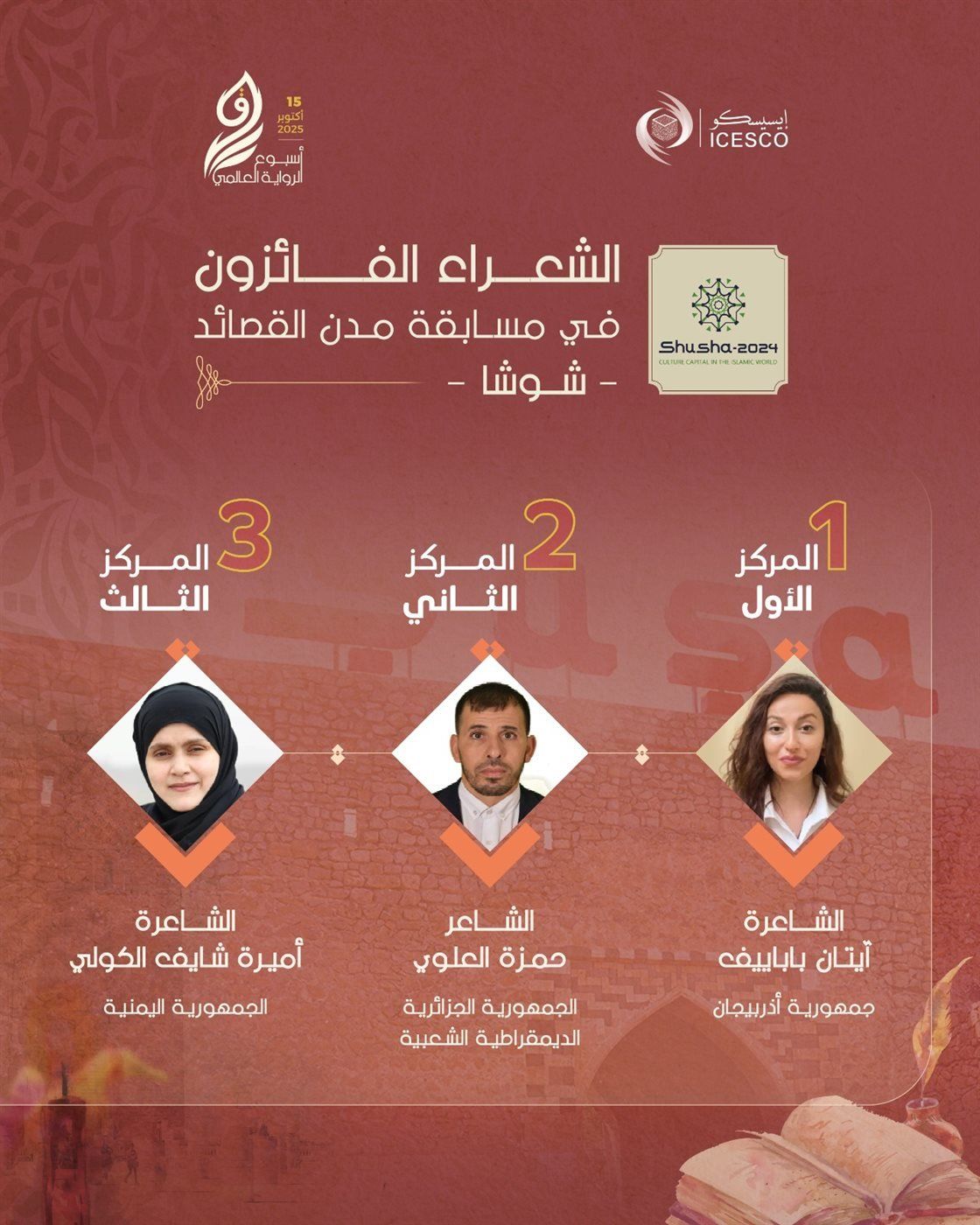 حصدت الشاعرة آيتان باباييف من أذربيجان المركز الأول في مسابقة “مدن القصائد”، وجاء في المركز الثاني الشاعر حمزة العلوي من الجمهورية الجزائرية الديمقراطية الشعبية، فيما نالت الشاعرة أميرة شايف الكولي من الجمهورية اليمنية المركز الثالث.