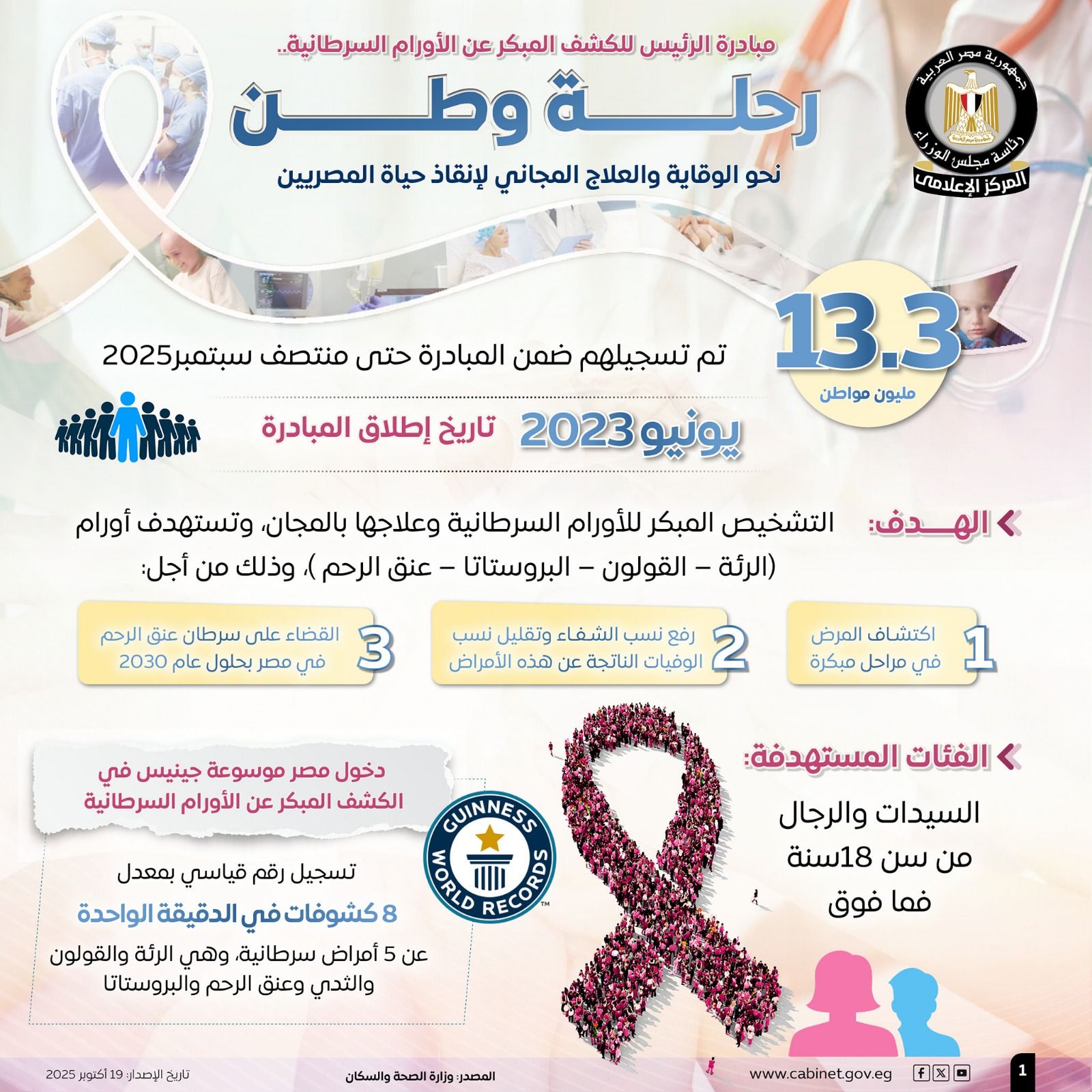 وكشف المركز الإعلامي لمجلس الوزراء، من خلال عدد من الإنفوجرافات المنشورة عبر منصاته الرسمية، عن أحدث إحصائيات المبادرة، مؤكدًا تسجيل نحو 13.3 مليون مواطن حتى منتصف سبتمبر 2025، ضمن برنامج الفحص المبكر المجاني للأورام.