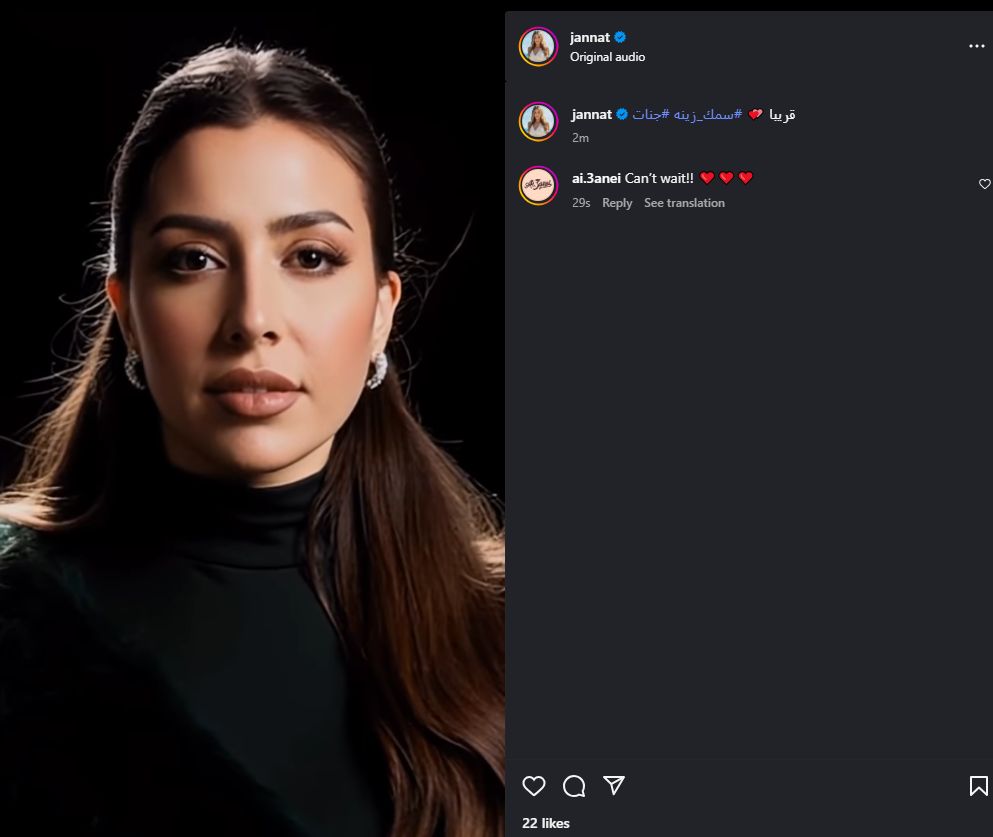 وشاركت الفنانة جنات، فيديو تشويقي لعمل غنائي جديد لها، وفقال لما رصده موقع تحيا مصر، عبر صفحتها الرسمية على موقع التواصل الاجتماعي إنستجرام وعلقت عليه: قريبا سمك زينة.