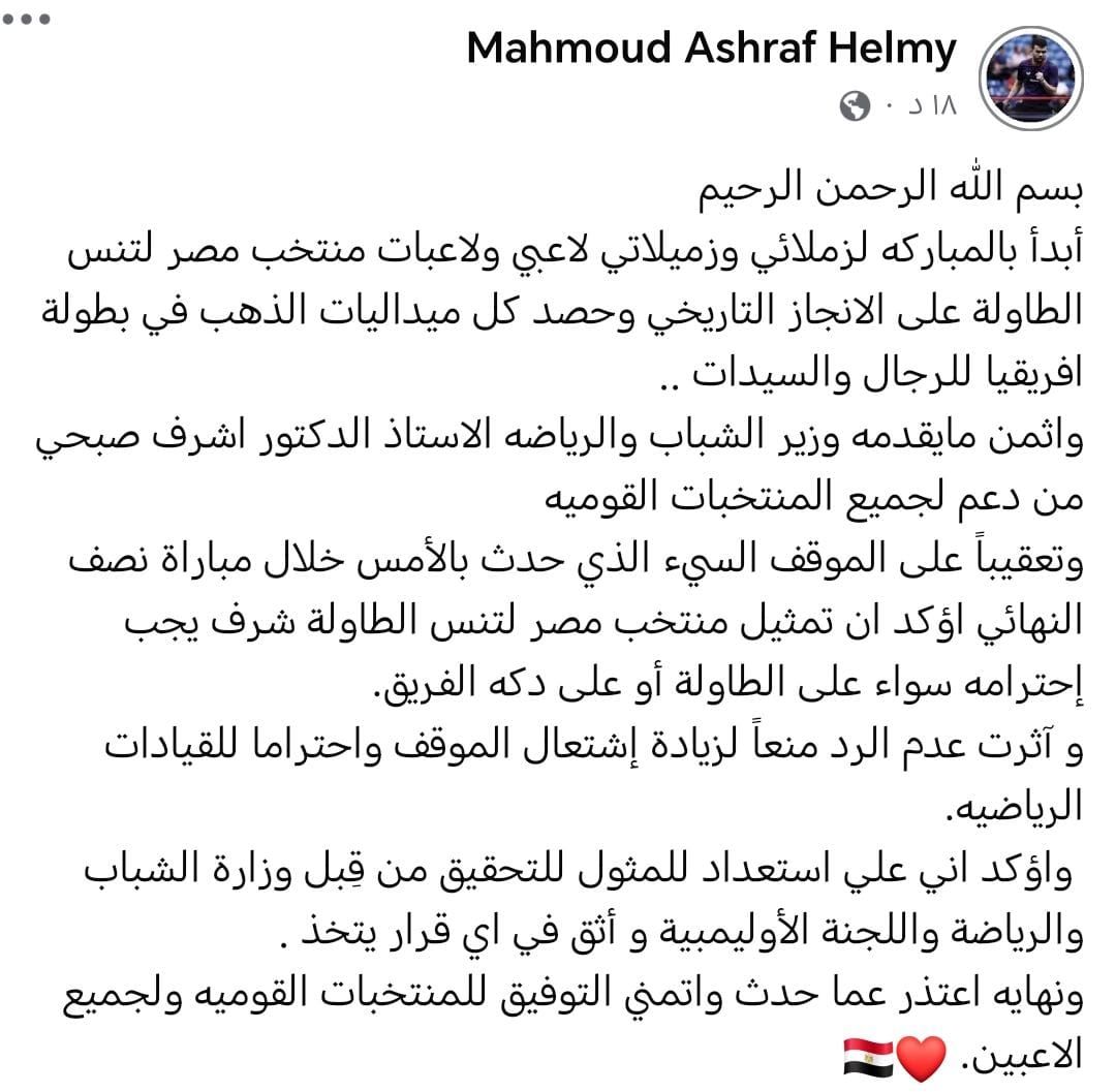 وأكمل :" وتعقيبًا على الموقف السيئ الذي حدث بالأمس خلال مباراة نصف النهائي، أؤكد أن تمثيل منتخب مصر لتنس الطاولة شرف يجب احترامه سواء على الطاولة أو على دكة الفريق، وآثرت عدم الرد منعًا لزيادة اشتعال الموقف واحتراما للقيادات الرياضية".