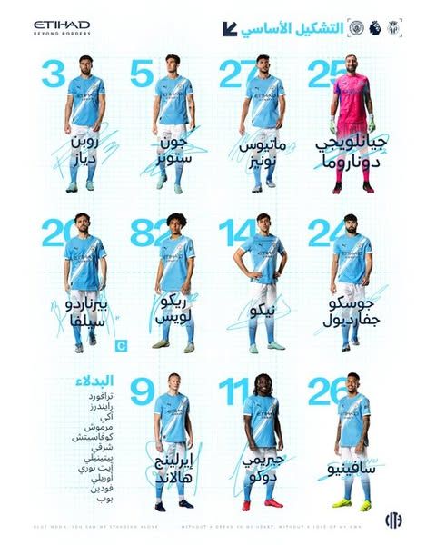في خط الهجوم: إيرلينج هالاند، جيريمي دوكو، عمر مرموش، سافينيو، أوسكار بوب.