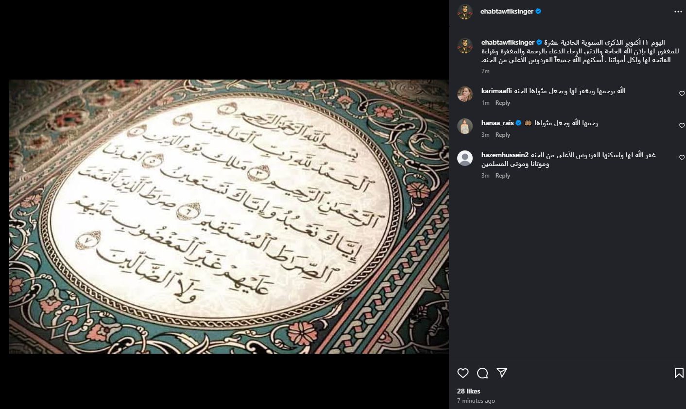 وكتب الفنان إيهاب توفيق، منشورا يحيي خلاله الذكرى 11 من وفاة والدته، وفقا لما رصده موقع تحيا مصر، وذلك عبر صفحته الرسمية على موقع التواصل الاجتماعي إنستجرام، وقال فيه: اليوم 22 أكتوبر الذكري السنوية الحادية عشرة للمغفور لها بإذن الله الحاجة والدتي الرجاء الدعاء بالرحمة والمغفرة وقراءة الفاتحة لها ولكل أمواتنا . أسكنهم الله جميعاً الفردوس الأعلي من الجنة.