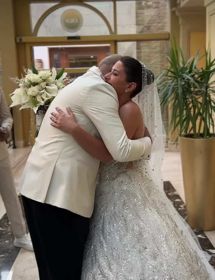 أما العروس، فكان اختيارها في الفستان موقف جدا، فظهرت بفستان بسيط كاب، واختارت تسريحة شعر هادئة ومناسبة، حيث اكتفت برفع شعرها على طريقة "الكحكة" مع وضع طرحه على شعرها بسيطة، وهو ما لفت أنظار الجمهور.