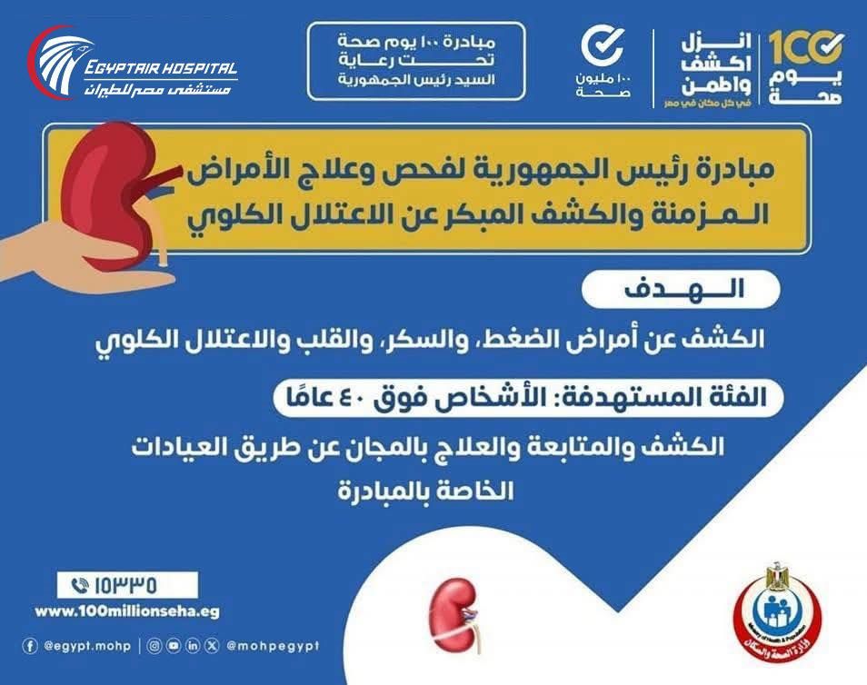 تعلن مستشفى مصر للطيران عن استضافتها لإحدى مبادرات "100 مليون صحة" تحت شعار "انزل – اكشف – اطمن"، وذلك للكشف المبكر وعلاج الأورام السرطانية والأمراض المزمنة بالمجان للعاملين والمواطنين، وذلك في إطار دعم المبادرات الرئاسية التي أطلقها الرئيس عبد الفتاح السيسي، وتأكيدًا على دورها الرائد في خدمة المجتمع.
