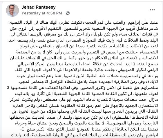 عبر حسابه الشخصي على موقع التواصل الاجتماعي "فيسبوك"، وفي منشور له طالب جهاد الرنتيسي نصر الله، برفض الجائزة، مضمنا حيثيات مطلبه: "عتبنا على إبراهيم، والعتب على قدر المحبة، تكونت نظرتي إليك هناك في البلاد القصية، شاعر مناضل قريب من الجبهة الشعبية لتحرير فلسطين، التنظيم الأقرب إلى الروح حتى في فترات الخلاف معه، ولم تكن طويلة، زاد احترامي لك مع معرفتي بالوسط الثقافي في البلد ونمط العلاقات فيه، رأيت فيك النموذج العصامي الذي صنع نفسه ولم يصنعه أحد، لديه من الامكانيات الذاتية ما يكفيه للتفرد بعيدا عن التسلق والتماهي حتى ذوبان الشخصية، اختلفت مع البعض في التقييم وأصريت على رأيي.