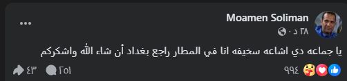ورد مؤمن سليمان على هذه الشائعات برسالة قصيرة نشرها عبر حسابه الرسمي على موقع "فيس بوك"، قال فيها: "يا جماعة دي إشاعة سخيفة، أنا في المطار راجع بغداد إن شاء الله، وأشكركم على اهتمامكم".