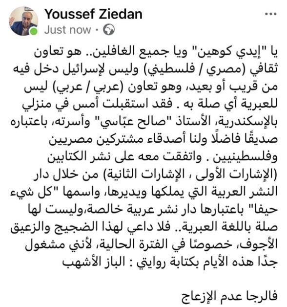 ولكن الكاتب الروائي يوسف زيدان رد على كوهين، في منشور له عبر حسابه على فيسبوك، قائلا: "يا إيدي كوهين" ويا جميع الغافلين.. هو تعاون ثقافي (مصري / فلسطيني) وليس لإسرائيل دخل فيه من قريب أو بعيد، وهو تعاون (عربي / عربي) ليس للعبرية أي صلة به".
