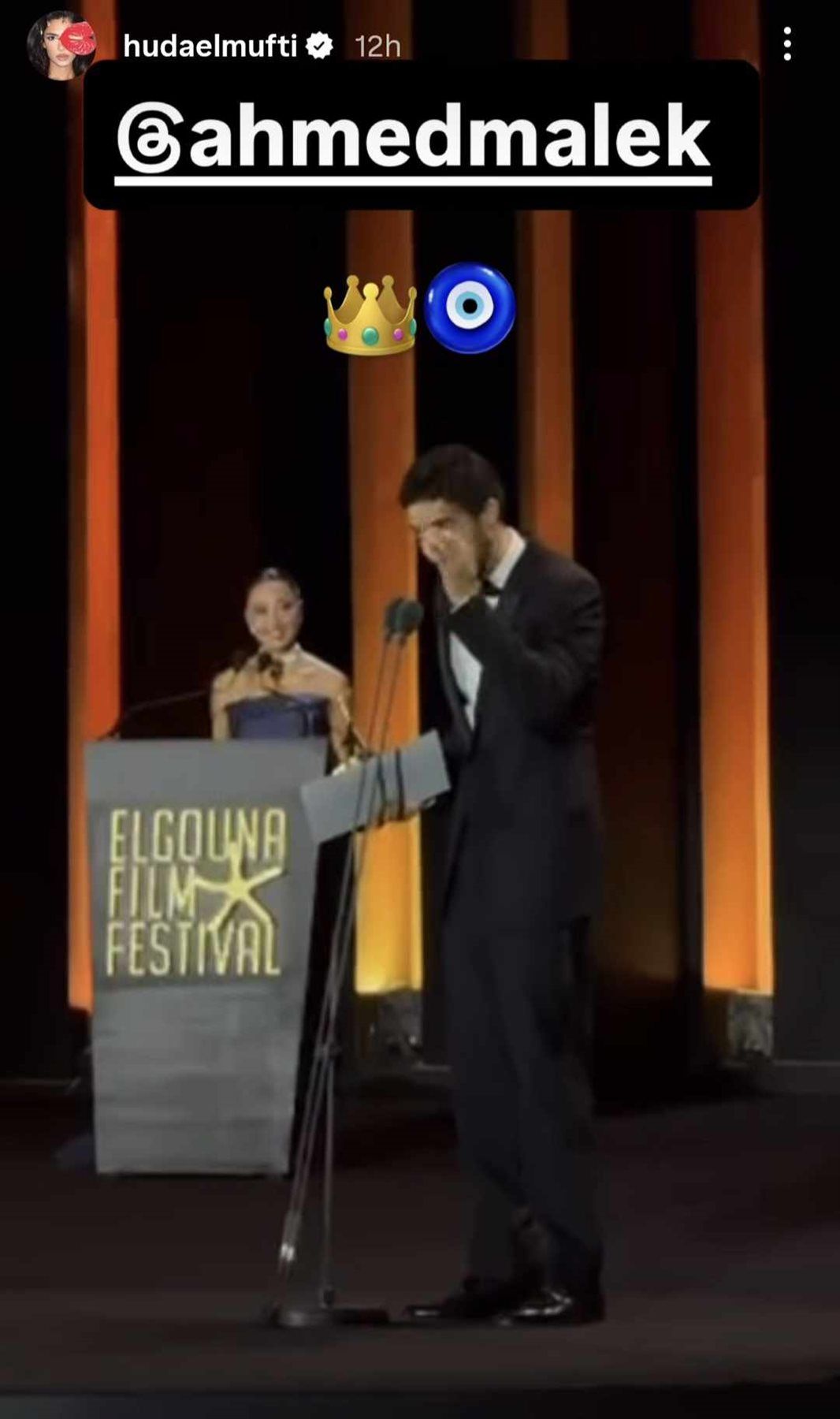 ونشرت هدى المفتي عبر خاصية القصص بحسابها الرسمي على إنستجرام مقطع فيديو رصده موقع تحيا مصر لأحمد مالك أثناء لحظة تسلمه الجائزة على المسرح، وأرفقت الصورة بتعليق بسيط يحمل اسمه، مع رمزي (تاج وخرزة زرقاء)، في لفتة تعبّر عن فخرها وسعادتها بفوزه.