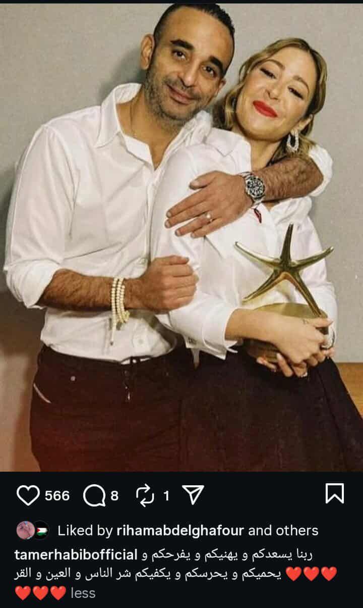 ونشر تامر حبيب في منشور رصده موقع تحيا مصر عبر حسابه الرسمي بموقع تبادل الصور والفيديوهات انستجرام، صورة لـ منة شلبي رفقة أحمد الجنايني، وعلق عليها، قائلا: "ربنا يسعدكم ويهنيكم ويفرحكم ويحميكم ويحرسكم ويكفيكم شر العين والقر.