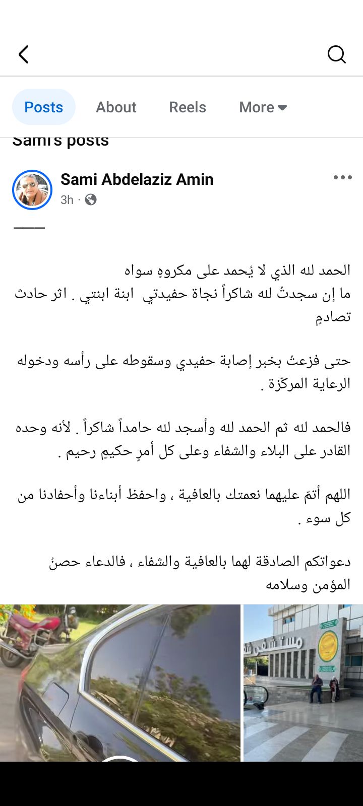 وكتب سامي عبد العزيز في منشور رصده موقع تحيا مصر على صفحته الرسمية بموقع التواصل الاجتماعي المختلفة: "الحمد لله الذي لا يُحمد على مكروهٍ سواه ما إن سجدتُ لله شاكراً نجاة حفيدتي ابنة ابنتي . اثر حادث تصادمٍ، حتى فزعتُ بخبر إصابة حفيدي وسقوطه على رأسه ودخوله الرعاية المركّزة .