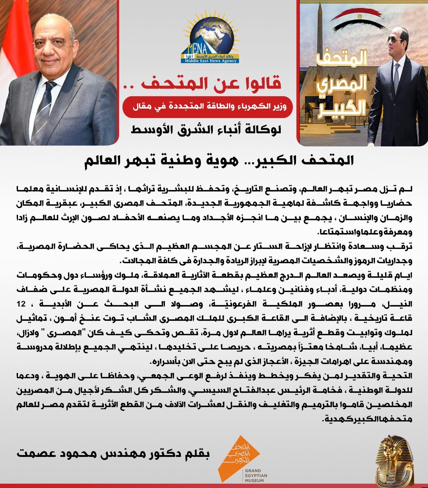 وأشار وزير الكهرباء والطاقة المتجددة الدكتور محمود عصمت إلى أن مصر والعالم كله ينتظران لحظة افتتاح هذا المتحف العالمي، الذي سيُزيح الستار عن أكبر متحف أثري مغطى في العالم، ليكون رمزًا جديدًا من رموز القوة الناعمة المصرية.