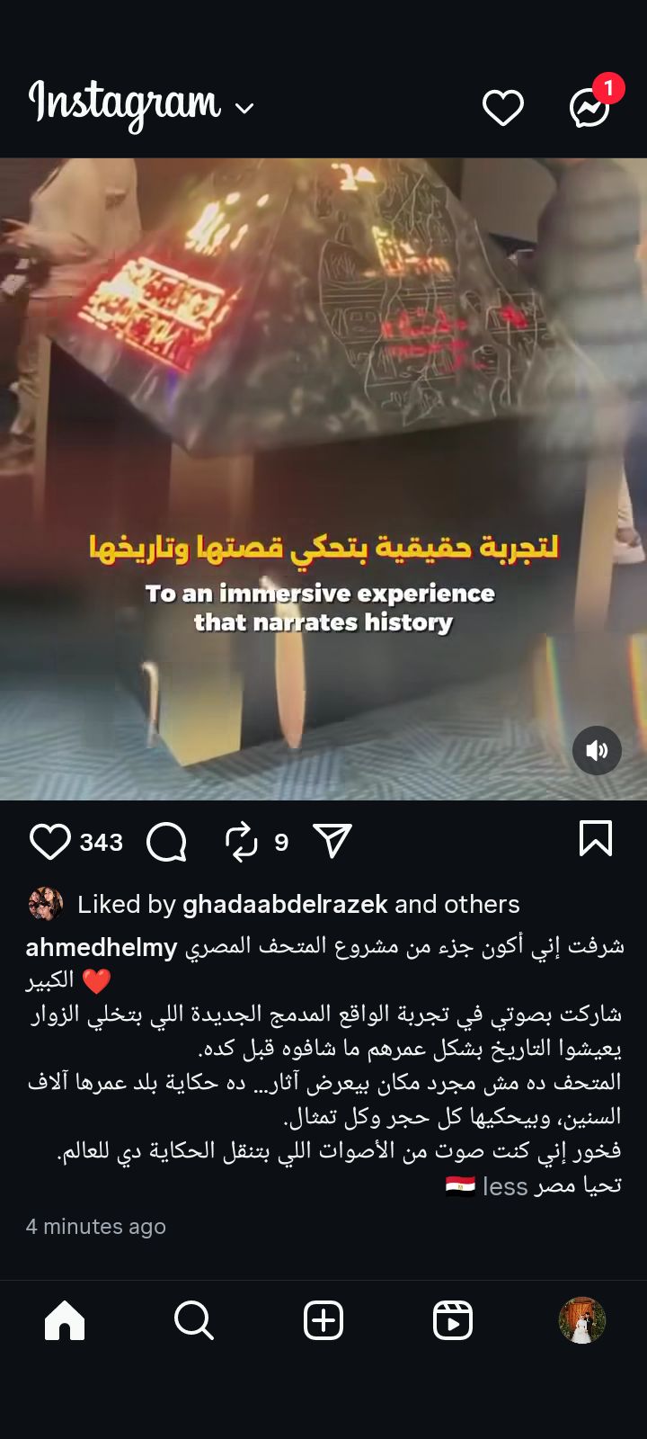 وقال أحمد حلمي في منشور رصده موقع تحيا مصر على حسابه الرسمي بموقع تبادل الصور والفيديوهات انستجرام: شرفت إني أكون جزء من مشروع المتحف المصري الكبير، شارکت بصوتي في تجربة الواقع المدمج الجديدة اللي بتخلي الزوار يعيشوا التاريخ بشكل عمرهم ما شافوه قبل كده.