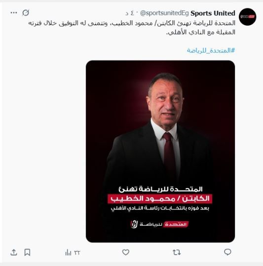 ونشرت المتحدة للرياضة صورة صورة للخطيب، وعلّقت عليها: "المتحدة للرياضة تهنئ الكابتن محمود الخطيب وتتمنى له التوفيق خلال فترة المقبلة مع النادي الأهلي".