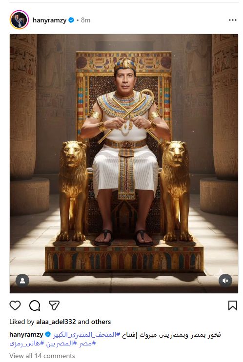 ونشر هاني رمزي، عبر حساباته الرسمية على مواقع التواصل الاجتماعي صورة له بالزي الفرعوني باستخدام تقنية الذكاء الاصطناعي، تعكس روح الحضارة المصرية القديمة وارتباطه بتاريخ بلده العريق، في خطوة أضفت لمسة إبداعية على احتفاله بالحدث العالمي، وعلَّق قائلًا: "فخور بمصر وبمصريتي مبروك افتتاح المتحف المصري الكبير".