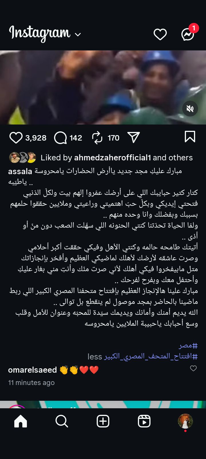 واختتمت: مبارك علينا هالإنجاز العظيم بإفتتاح متحفنا المصري الكبير اللي ربط ماضينا بالحاضر بمجد موصول لم ينقطع بل توالى ... الله يديم أمنك وأمانك ويديمك سيدة للمحبه وعنوان للأمل وقلب وسع أحبابك ياحبيبة الملايين يا محروسه.