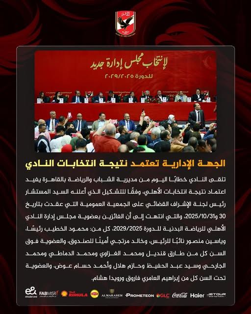 تحيا مصر، وفقًا للتشكيل الذي أعلنه السيد المستشار رئيس لجنة الإشراف القضائي على الجمعية العمومية التي عقدت بتاريخ 30 و31/10/2025، والتي انتهت إلى أن الفائزين بعضوية مجلس إدارة النادي الأهلي للرياضة البدنية للدورة 2025/2029، كل من: محمود الخطيب رئيسًا، وياسين منصور نائبًا للرئيس، وخالد مرتجي أمينًا للصندوق، والعضوية فوق السن كل من طارق قنديل ومحمد الغزاوي ومحمد الدماطي ومحمد الجارحي وسيد عبد الحفيظ وحازم هلال وأحمد حسام عوض، والعضوية تحت السن كل من إبراهيم العامري فاروق ورويدا هشام.