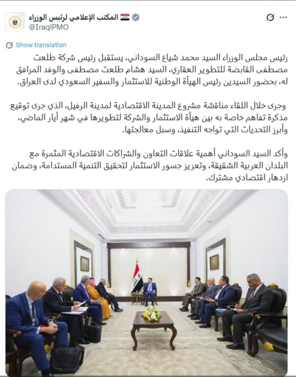 استقبل رئيس مجلس الوزراء العراقي محمد شياع السوداني، رئيس مجموعة طلعت مصطفى القابضة للتطوير العقاري، هشام طلعت مصطفى والوفد المرافق له، بحضور كل من رئيس الهيئة الوطنية للاستثمار العراقي والسفير السعودي لدى العراق.