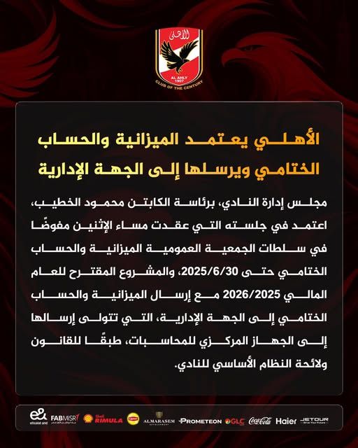 مجلس إدارة النادي الأهلي، برئاسة محمود الخطيب، اعتمد في جلسته التي عقدت مساء الإثنين مفوضًا في سلطات الجمعية العمومية الميزانية والحساب الختامي حتى 30/6/2025، والمشروع المقترح للعام المالي 2025/2026، مع إرسال الميزانية والحساب الختامي إلى الجهة الإدارية، التي تتولى إرسالها إلى الجهاز المركزي للمحاسبات، طبقًا للقانون ولائحة النظام الأساسي للنادي.
