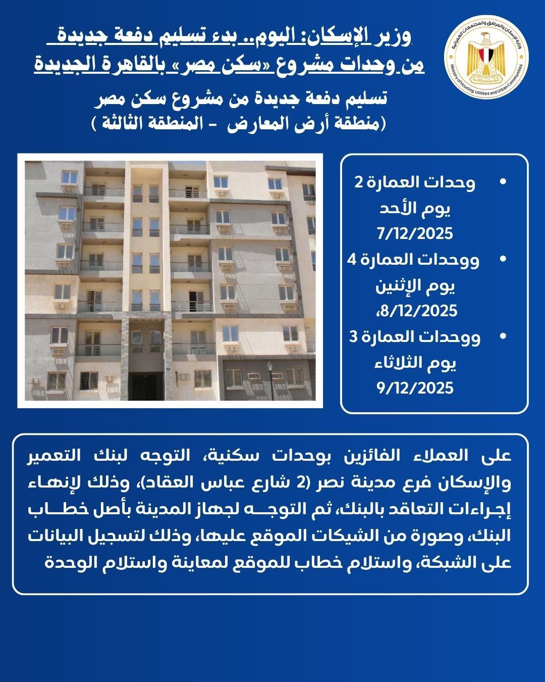 وقال: سيتم تسليم وحدات العمارة 2، يوم الأحد 7/12/2025، ووحدات العمارة 4، يوم الإثنين 8/12/2025، ووحدات العمارة 3، يوم الثلاثاء 9/12/2025، مضيفاً أنه على العملاء الفائزين بوحدات سكنية، التوجه لبنك التعمير والإسكان فرع مدينة نصر (2 شارع عباس العقاد)، وذلك لإنهـاء إجـراءات التعاقد بالبنك، ثم التوجـــه لجهاز المدينة بأصل خطـــاب البنك، وصورة من الشيكات الموقع عليها، وذلك لتسجيل البيانات على الشبكة، واستلام خطاب للموقع لمعاينة واستلام الوحدة.