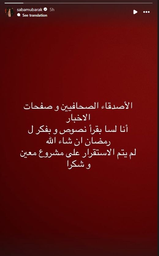 وكتبت الفنانة صبا مبارك، منشورا توضح من خلاله حقيقة مشاركتها في موسم مسلسلات رمضان 2026، وفقا لما رصده موقع تحيا مصر، عبر استوري صفحتها الرسمية على موقع التواصل الاجتماعي إنستجرام، وقالت فيه: الأصدقاء الصحفيين وصفحات الأخبار أنا لسا بقرأ نصوص وبفكر لـ رمضان إن شاء الله، لم يتم الاستقرار على مشروع معين وشكرًا.