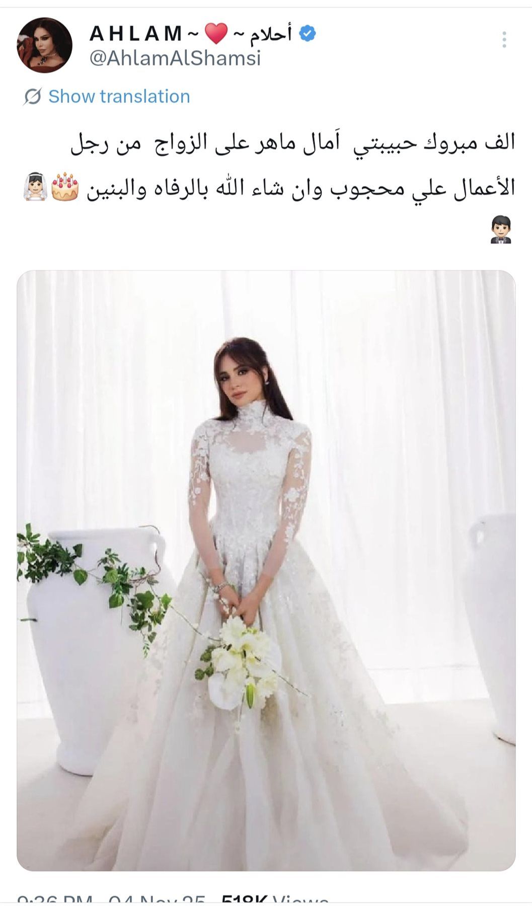 وكتبت أحلام عبر حسابها على موقع "إكس": "ألف مبروك يا حبيبتي َآمال ماهر على الزواج من رجل الأعمال علي محجوب وإن شاء الله بالرفاء والبنين".
