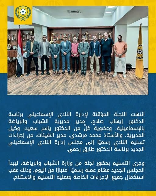 انتهت اللجنة المؤقتة لإدارة النادي الإسماعيلي برئاسة الدكتور إيهاب صلاح، مدير مديرية الشباب والرياضة بالإسماعيلية، وعضوية كل من الدكتور ياسر سعيد، وكيل المديرية، والأستاذ محمد مرشدي، مدير الهيئات، من إجراءات تسليم النادي رسميًا إلى مجلس إدارة النادي الإسماعيلي الجديد برئاسة الدكتور طارق رحمي.