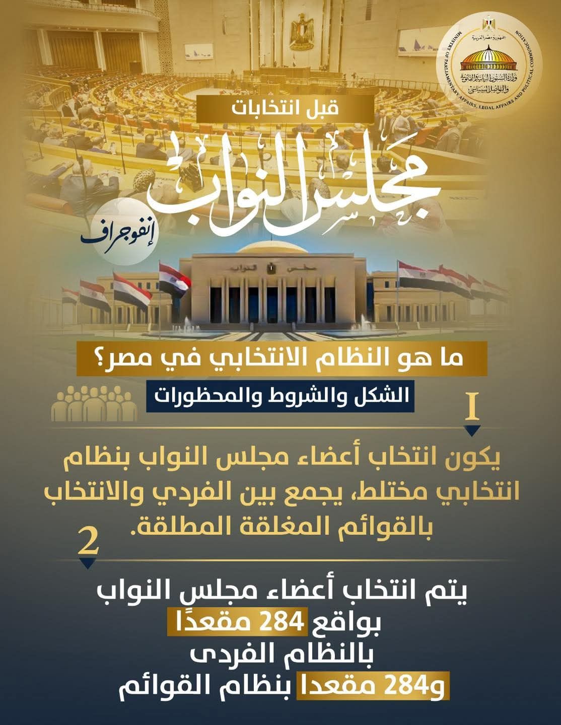 نشرت وزارة الشؤون النيابية والقانونية والتواصل السياسي انفوجرافًا ضمن حملة توعوية للتعريف بنظام انتخابات مجلس النواب قبل انطلاق الاستحقاق الانتخابي المرتقب.