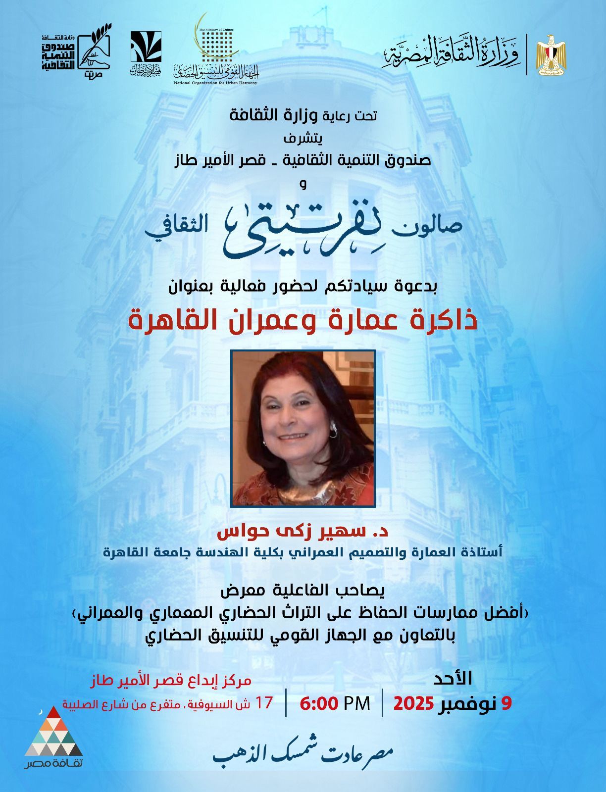 من أجل تعزيز الحوار الثقافي والفكري حول قضايا التراث والهوية في ضوء التطورات المعاصرة، يعقد صالون نفرتيتي الثقافي فعالية جديدة بعنوان “ذاكرة عمارة وعمران القاهرة”، يستضيف فيها الدكتورة سهير زكي حواس، أستاذ العمارة والتصميم المعماري بكلية الهندسة – جامعة القاهرة، وذلك يوم الأحد المقبل٩ نوفمبر في تمام الساعة السادسة مساء بقصر الأمير طاز التابع لقطاع صندوق التنمية الثقافية.