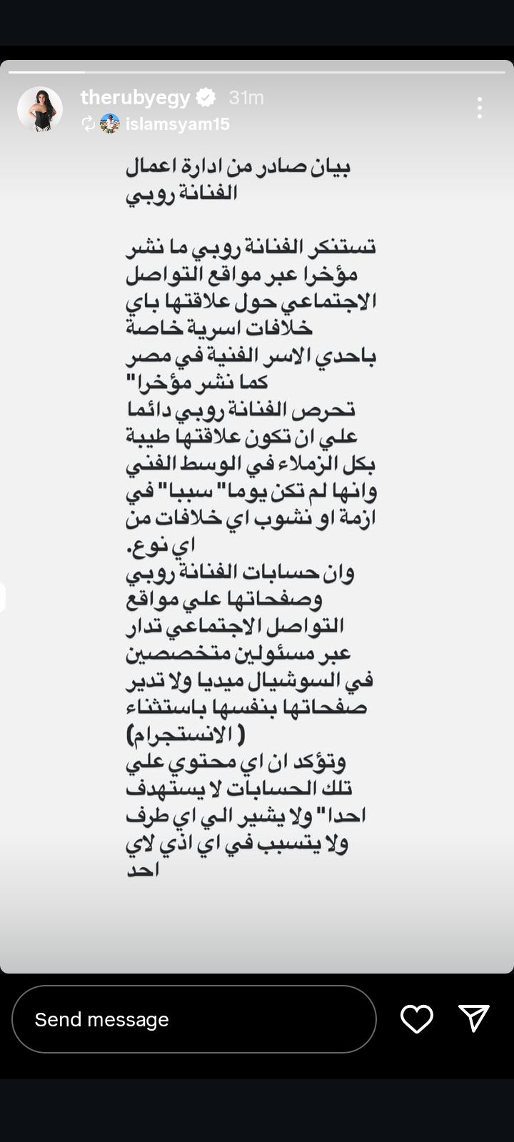 وأكد البيان: حسابات الفنانة روبي وصفحاتها على مواقع التواصل الاجتماعي تدار عبر مسؤولين متخصصين في السوشيال ميديا ولا تدير صفحاتها بنفسها باستثناء الإنستجرام، وتؤكد أن أي محتوى على تلك الحسابات لا يستهدف أحدًا ولا يشير إلى أي طرف.