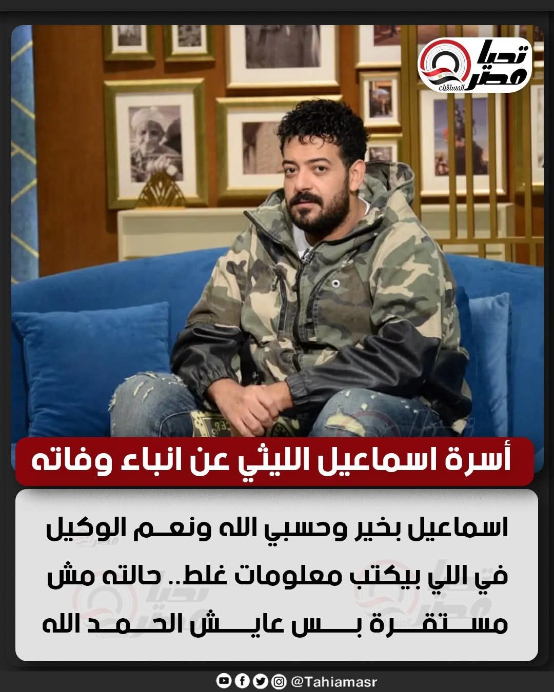 ونفت أسرة اسماعيل الليثي نبأ وفاته، حيث قالت: "اسماعيل بخير وحسبي الله ونعم الوكيل في اللي بكيتب معلومات غلط، حالته مش مستقرة بس عايش الحمدلله".