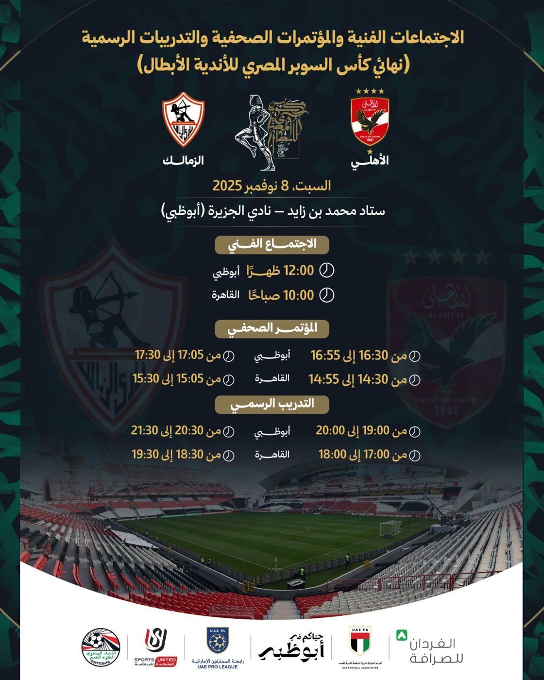 الثالثة و5 دقائق عصرا بتوقيت القاهرة الخامسة و5 دقائق مساءً بتوقيت الإمارات، المؤتمر الصحفي الخاصة بمباراة النهائي بين الأهلي والزمالك.