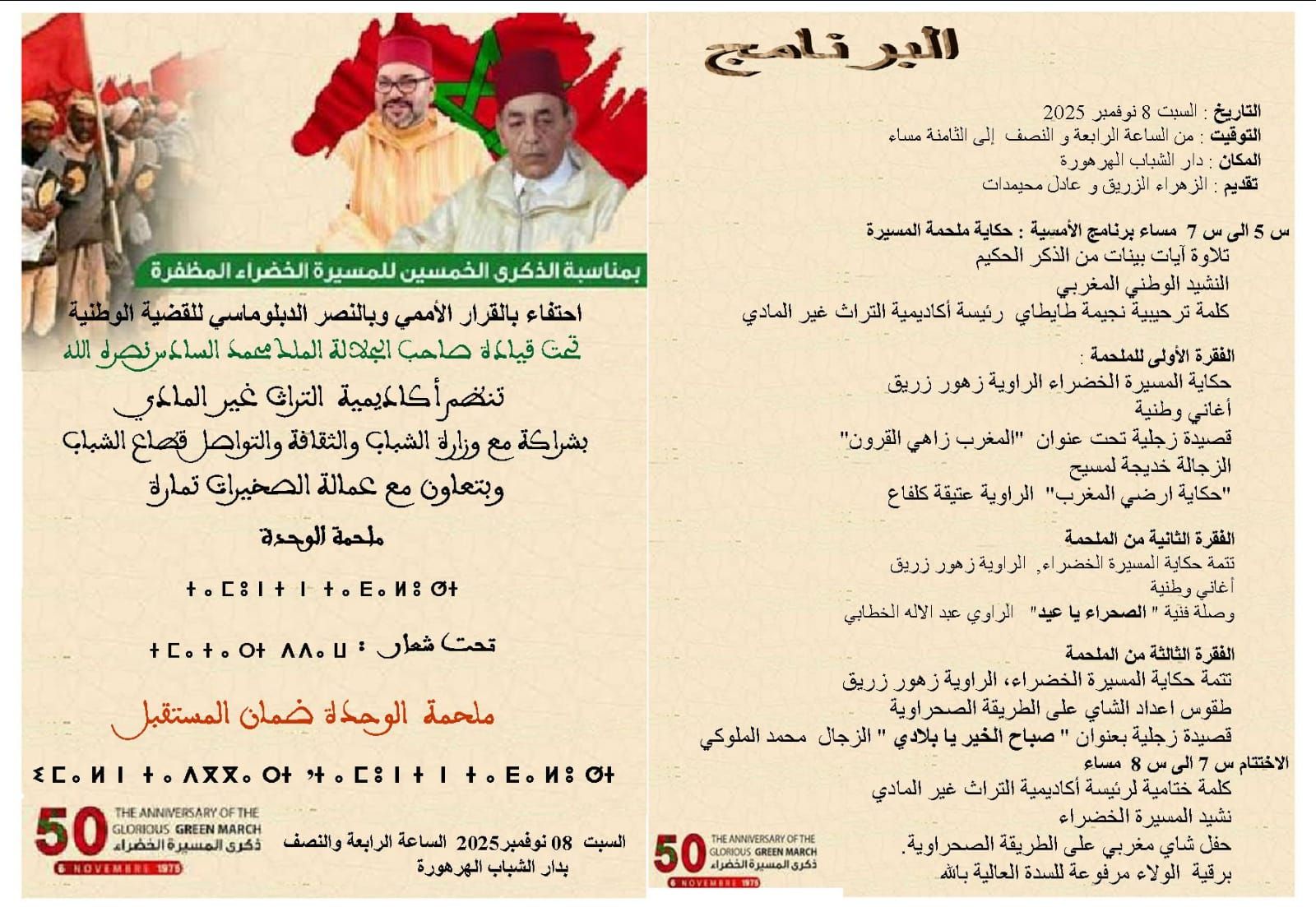 ويأتي الاحتفاء بالذكرى الخمسين للمسيرة الخضراء في إطار تخليد هذه المحطة التاريخية التي جسدت الإرادة المغربية في الدفاع عن الوحدة الترابية، والتوجيهات الملكية الرامية إلى تعزيز قيم الانتماء الوطني وترسيخ الارتباط بالثوابت الدستورية والرموز الوطنية.