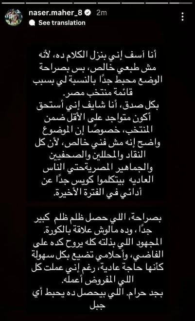 وفي أول تعليق له بعد إعلان القائمة، كتب ناصر ماهر عبر حسابه الشخصي على موقع "إنستجرام": "أنا آسف إني بنزل الكلام ده لأنه مش طبيعي خالص، لكن بصراحة الوضع محبط جدًا بالنسبة لي بسبب قائمة منتخب مصر".