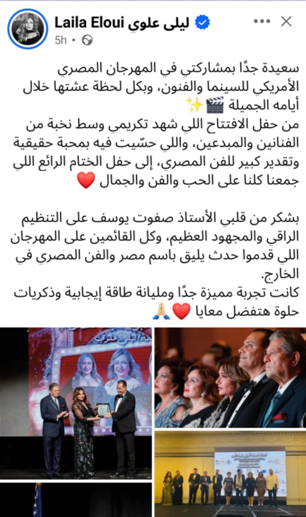 وجاءت رسالة الفنانة ليلى علوي: "سعيدة جدًا بمشاركتي في المهرجان المصري الأمريكي للسينما والفنون، وبكل لحظة عشتها خلال أيامه الجميلة، من حفل الافتتاح اللي شهد تكريمي وسط نخبة من الفنانين والمبدعين، واللي حسّيت فيه بمحبة حقيقية وتقدير كبير للفن المصري، إلى حفل الختام الرائع اللي جمعنا كلنا على الحب والفن والجمال".