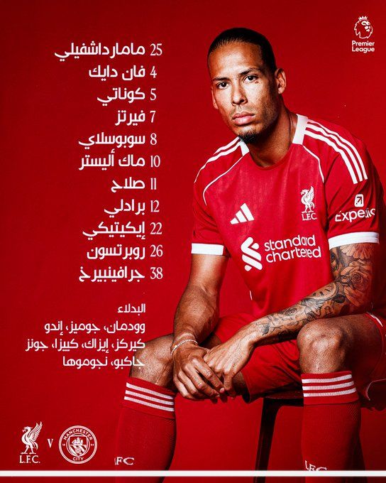 تشكيل ليفربول الرسمي ضد مانشستر سيتي في الدوري الإنجليزي الممتاز