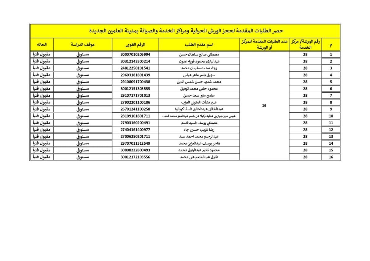 أعلن الدكتور مهندس محمد خلف الله، رئيس جهاز مدينة العلمين الجديدة والمشرف على جهاز القرى السياحية، عن إجراء القرعة العلنية لبيع عدد (10) ورش حرفية و(21) مركز خدمة وصيانة، وذلك بين السادة الذين انطبقت عليهم الشروط والضوابط الواردة بكراسة الشروط المعتمدة وطبقًا للكشوف المرفقة.