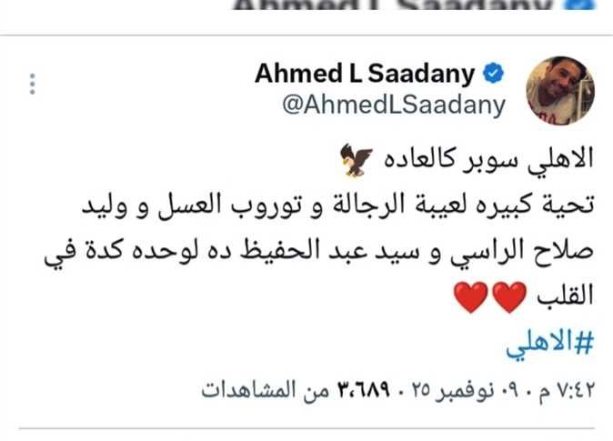 وكتب الفنان احمد السعدني، منشورا يحتفل فيه بفوز النادي الأهلي بكأس السوبر المصري، وفقا لما رصده موقع تحيا مصر، عبر حسابه الشخصي على موقع التواصل الاجتماعي إكس، قائلا: الاهلي سوبر كالعاده، تحية كبيره للعيبة الرجالة وتوروب العسل ووليد صلاح الراسي وسيد عبدالحفيظ ده لوحده كدة في القلب الأهلي.