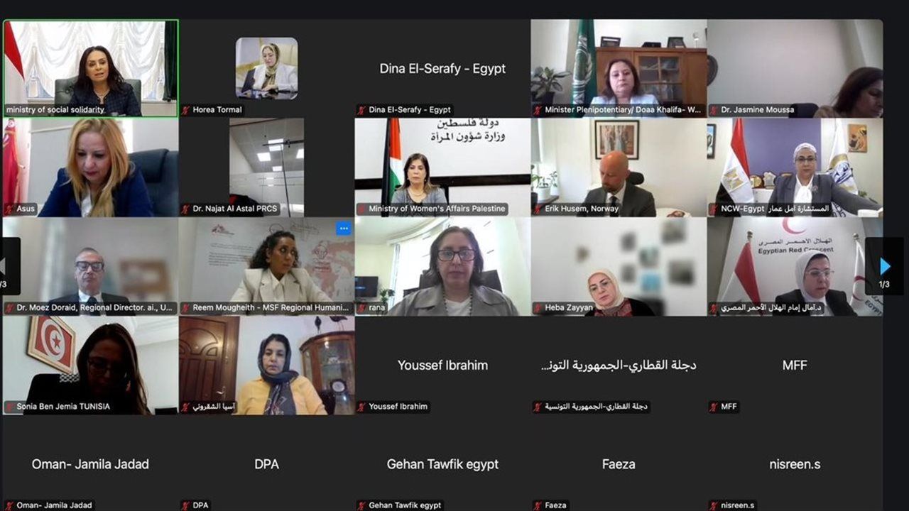 شاركت الدكتورة مايا مرسي وزيرة التضامن الاجتماعي عبر تقنية "الفيديو كونفرانس" في جلسة حوارية إقليمية نظمتها جامعة الدول العربية تحت عنوان" التجويع كسلاح حرب – الحصار والعدوان الإسرائيلي وتداعياته على النساء في قطاع غزة والأراضي الفلسطينية المحتلة".
