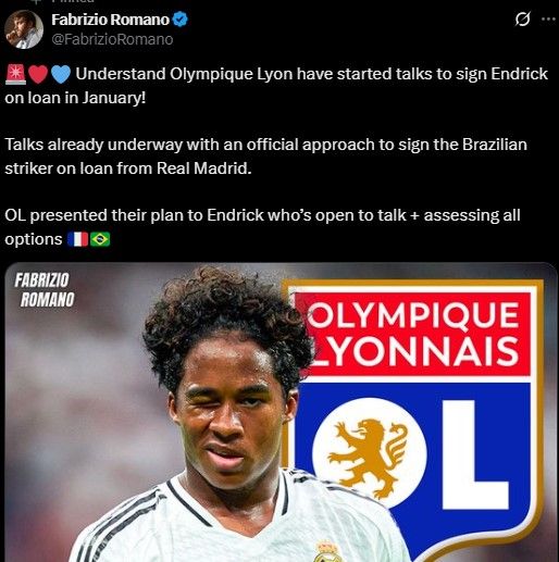بحسب ما كشفه الصحفي الشهير فابريزيو رومانو عبر منصة التواصل الاجتماعي "إكس"، فإن نادي أولمبيك ليون الفرنسي بدأ مفاوضات رسمية مع ريال مدريد من أجل التعاقد مع المهاجم البرازيلي إندريك على سبيل الإعارة خلال فترة الانتقالات الشتوية في يناير المقبل.