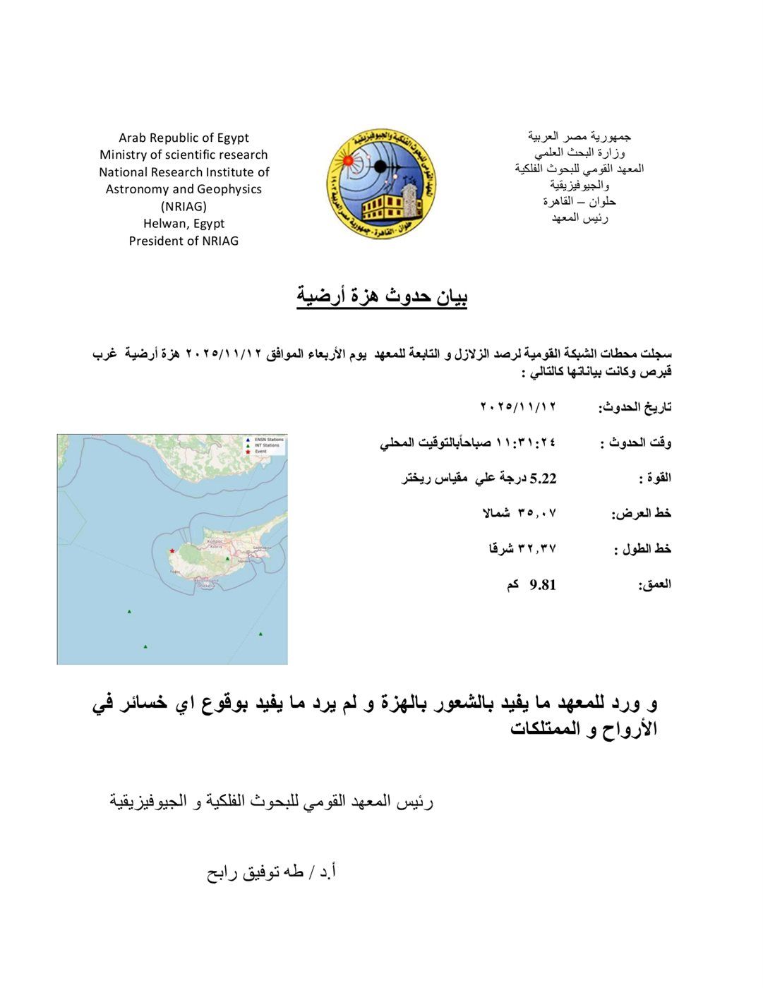 وقال الدكتور طه رابح، رئيس المعهد، في بيان- تلقى الدستور نسخة منه- إن محطات الشبكة القومية لرصد الزلازل التابعة لمعهد الفلك سجلت هزة أرضية غرب قبرص في الساعة الحادية عشر و31 دقيقة صباح الأربعاء، بقوة 5.22 درجة على مقياس ريختر.