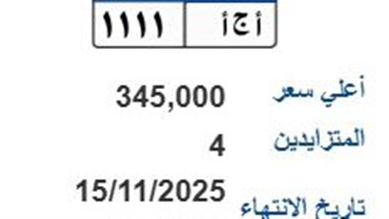 ومن ضمن اللوحات التي تُجرى المُزايدة عليها، لوحة تحمل رقم (أ ج آ-1111) ووصل سعرها حتى الآن 345 ألف جنيه وتنتهي المزايدة عليها 15 نوفمبر2025.