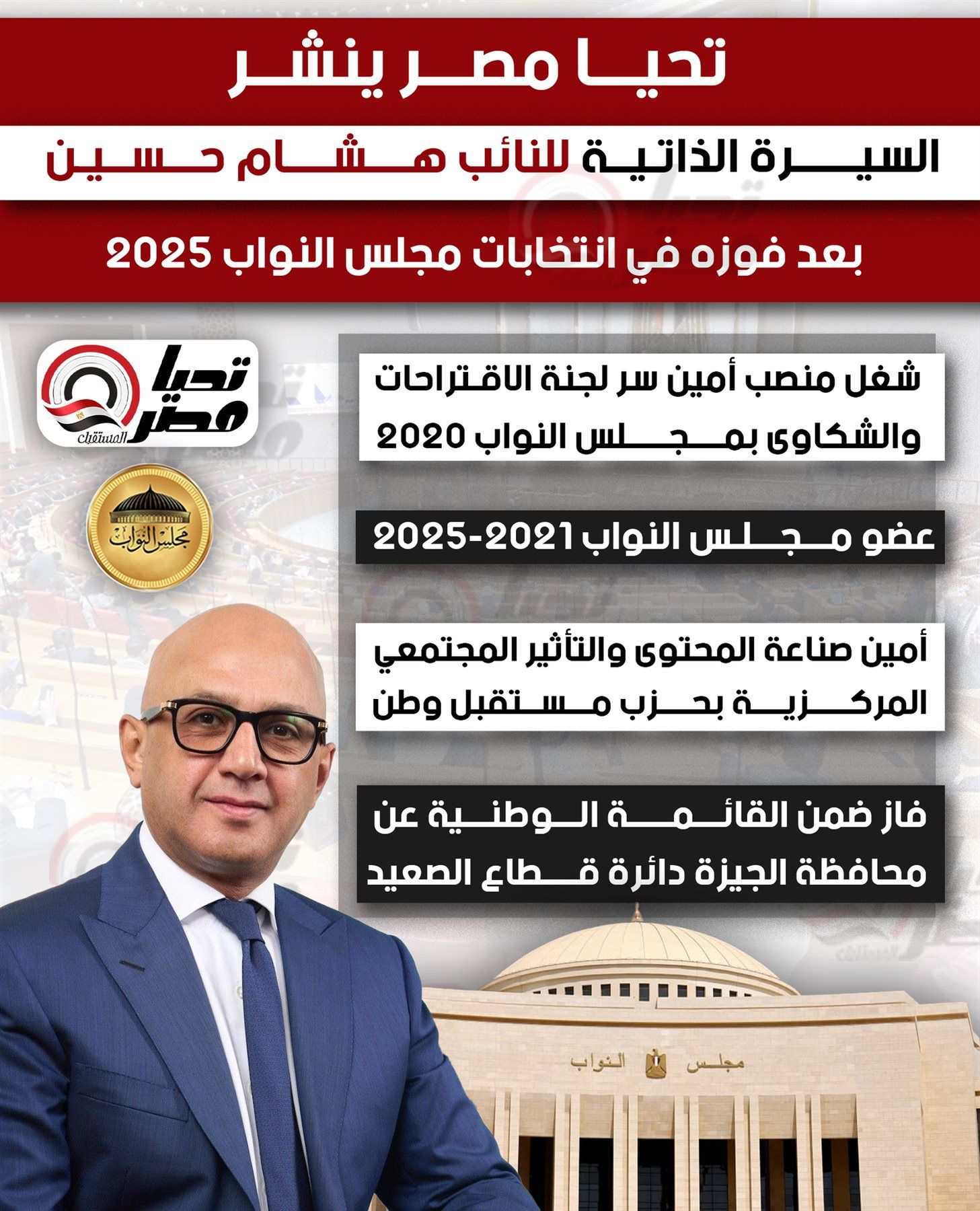 و ينشر تحيا مصر السيرة الذاتية للنائب هشام حسين، والتي جاءت كالتالي: