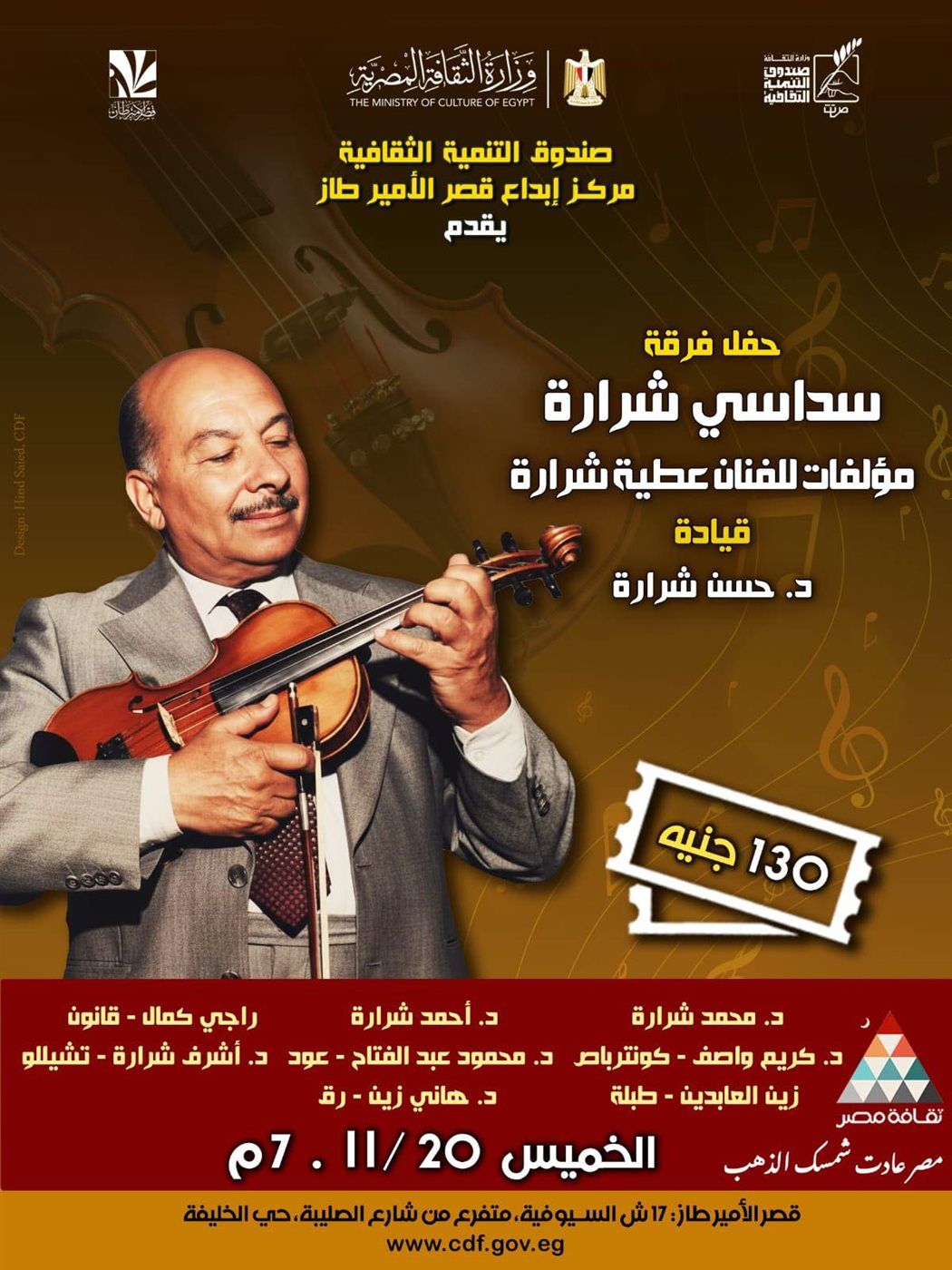 ينظم مركز إبداع "قصر الأمير طاز" بالخليفة، التابع لقطاع صندوق التنمية الثقافية، حفل جديد لفرقة "سداسى شرارة" من مؤلفات الفنان عطية شرارة، بقيادة د.حسن شرارة، الخميس الموافق 20 نوفمبر، في السابعة مساءً.