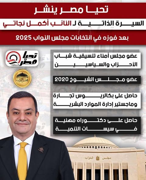 ينشر موقع تحيا مصر السيرة الذاتية للنائب أكمل نجاتي، بعد فوزه في انتخابات مجلس النواب 2025 ضمن القائمة الوطنية من أجل مصر عن قطاع غرب الدلتا، وذلك تقديرًا لمسيرته السياسية والبرلمانية الممتدة خلال السنوات الماضية.