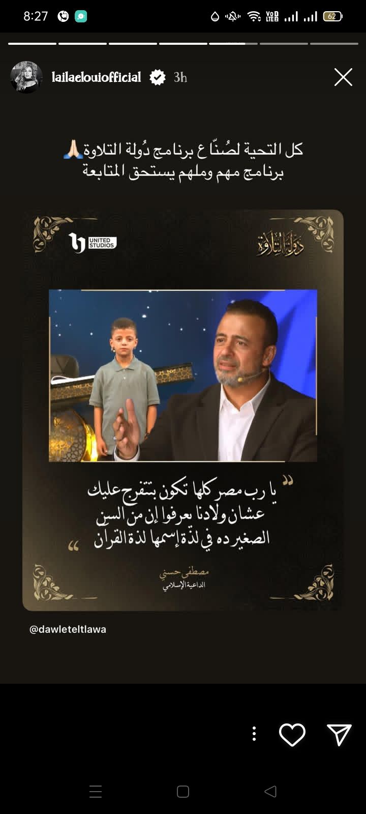 وكتبت الفنانة ليلى علوي، منشورا تشيد من خلاله ببرنامج دولة التلاوة، وفقا لما رصده موقع تحيا مصر، وذلك عبر صفحتها الرسمية على موقع التواصل الاجتماعي إنستجرام، قالت فيه: كل التحية لصناع برنامج دولة التلاوة، مهم وملهم ويستحق المتابعة.