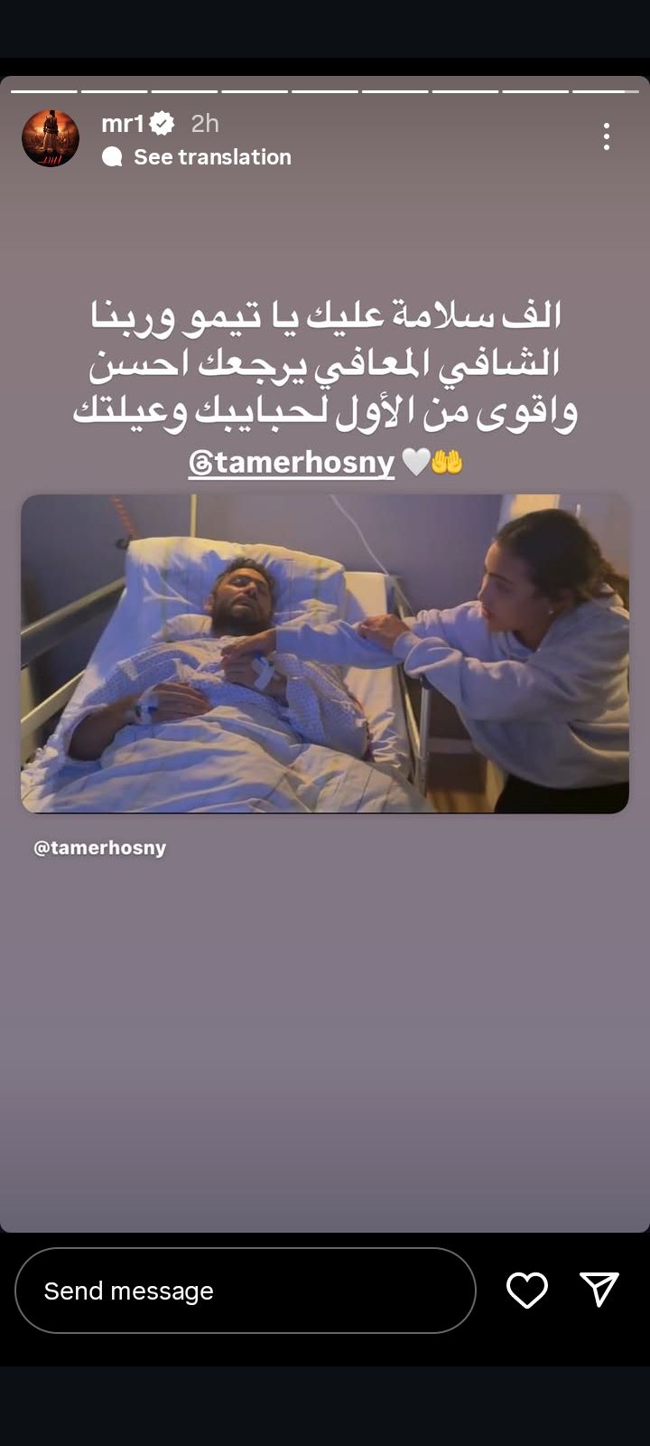 وكتب محمد رمضان في منشور رصده موقع تحيا مصر على حسابه الرسمي بموقع تبادل الصور والفيديوهات انستجرام، موجها حديثه لـ تامر حسني: "ألف سلامة عليك يا تيمو، ربنا الشافي المعافي ويارب يرجعك لينا بالسلامة وأحسن وأقوى من الأول لحبايبك وعيلك".