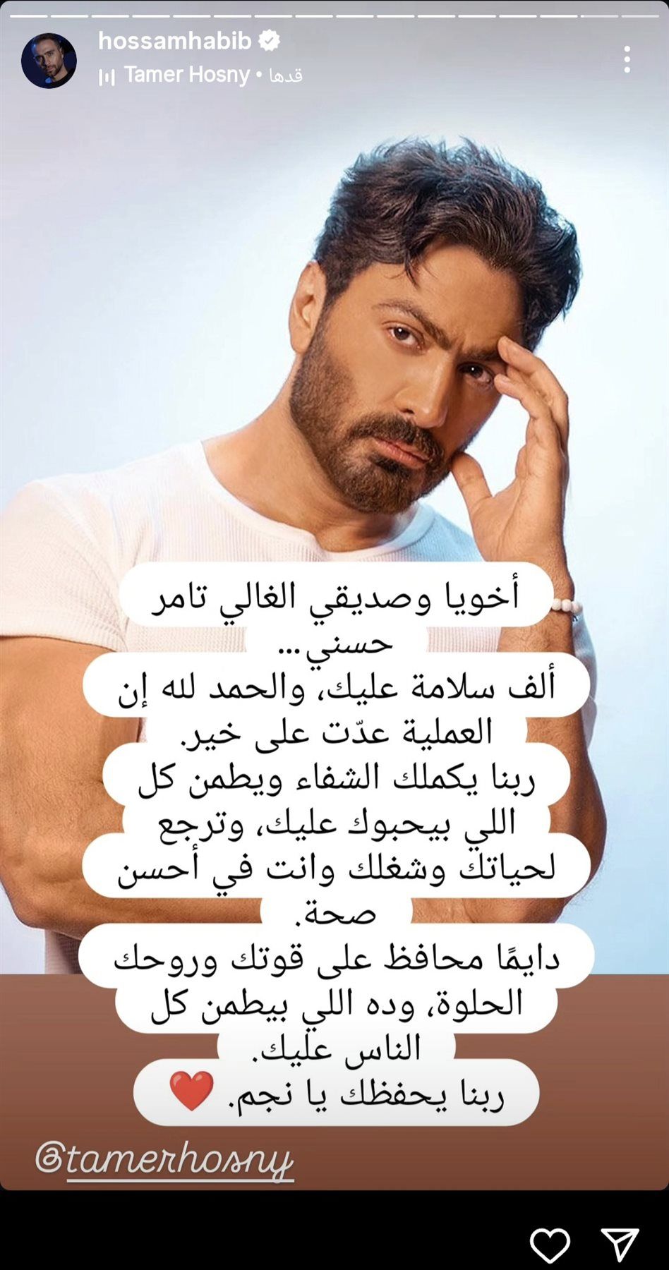 ونشر حسام عبر خاصية "ستوري" على حسابه الرسمي بموقع "إنستجرام" صورة لتامر حسني، مصحوبة بتعليق جاء فيه: "أخويا وصديقي الغالي تامر حسني.. ألف سلامة عليك، والحمد لله أن العملية عدت على خير.. ربنا يكملك الشفاء ويطمن كل اللي بيحبوك عليك، وترجع لحياتك وشغلك وأنت في أحسن صحة".