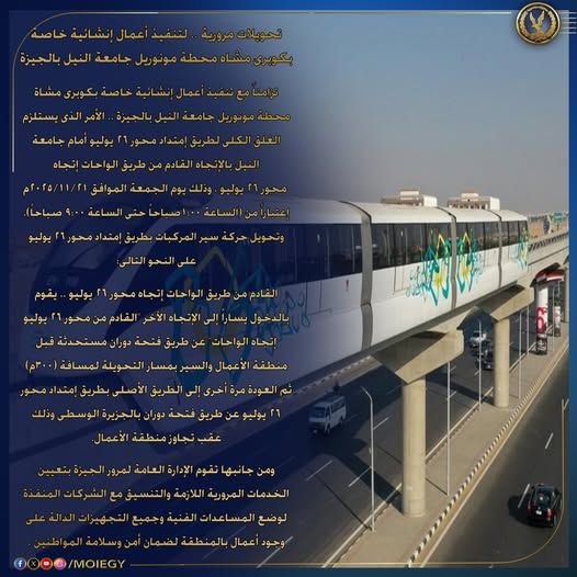 أعلنت الإدارة العامة لمرور الجيزة عن اتخاذ عدد من الإجراءات المرورية لتنفيذ أعمال إنشائية خاصة بكوبري مشاة محطة مونوريل جامعة النيل، وذلك ضمن خطة التطوير الجارية بالمحافظة.